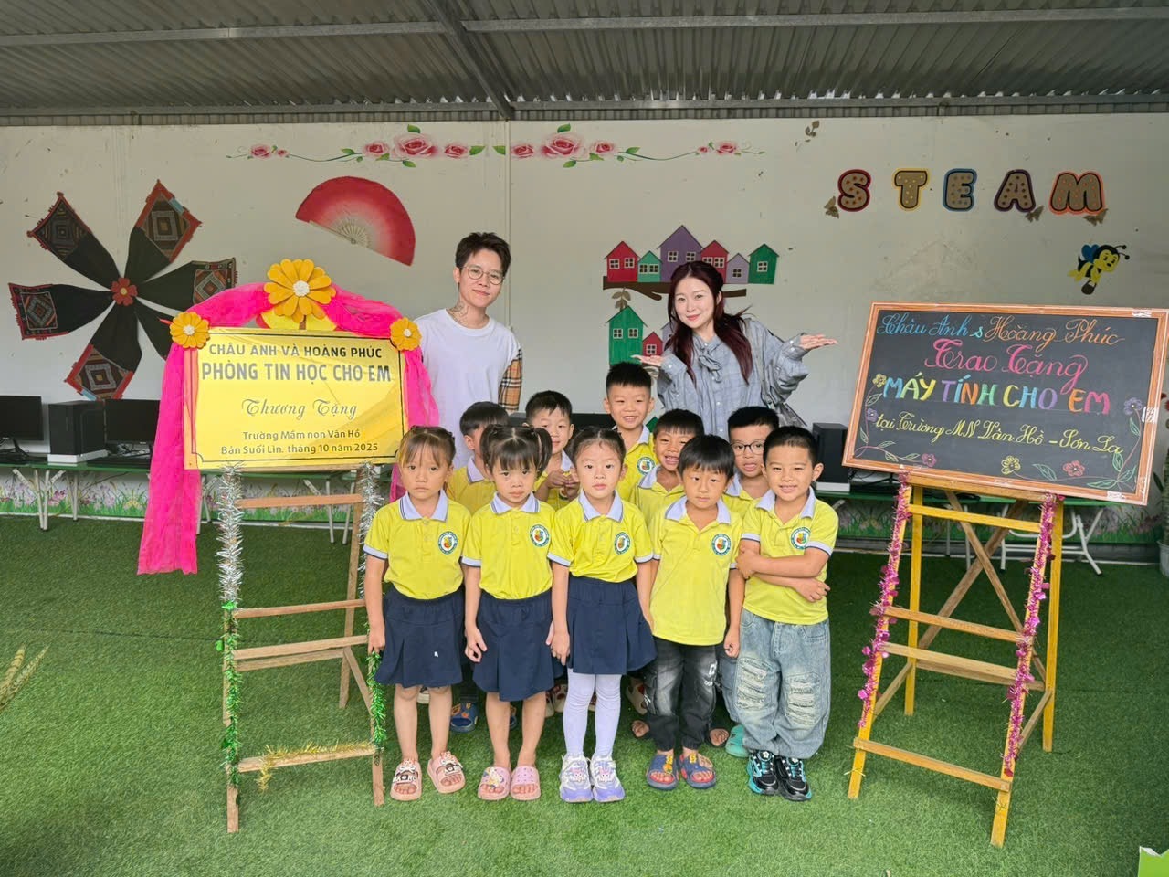 Châu Anh cùng Hoàng Phúc trao tặng “Phòng tin học cho em” cho các em học sinh thuộc Trường Mầm non Vân Hồ, tỉnh Sơn La