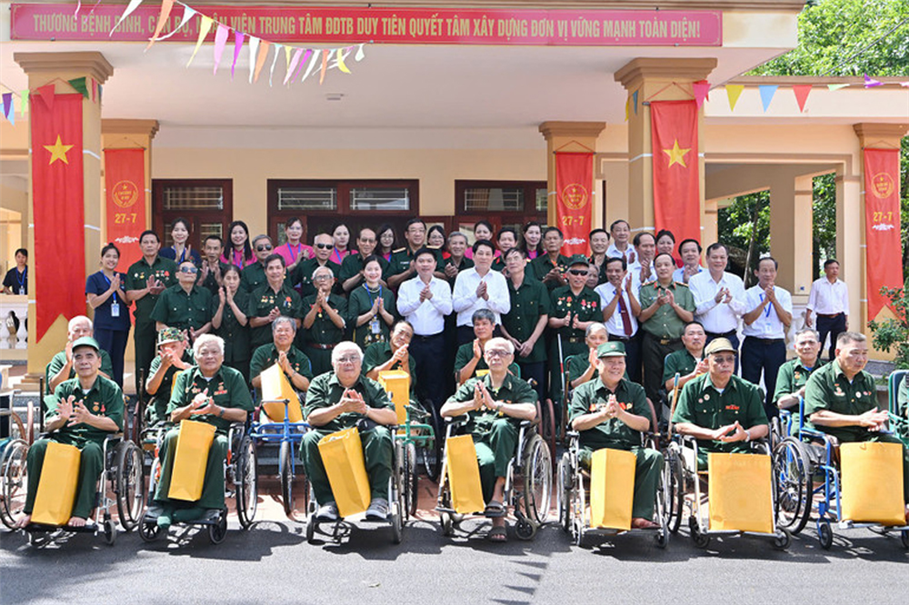 Chủ tịch nước Lương Cường thăm, tặng quà các thương binh tại Trung tâm Điều dưỡng Thương binh Duy Tiên (ngày 23/7/2025). Ảnh: nhandan.vn