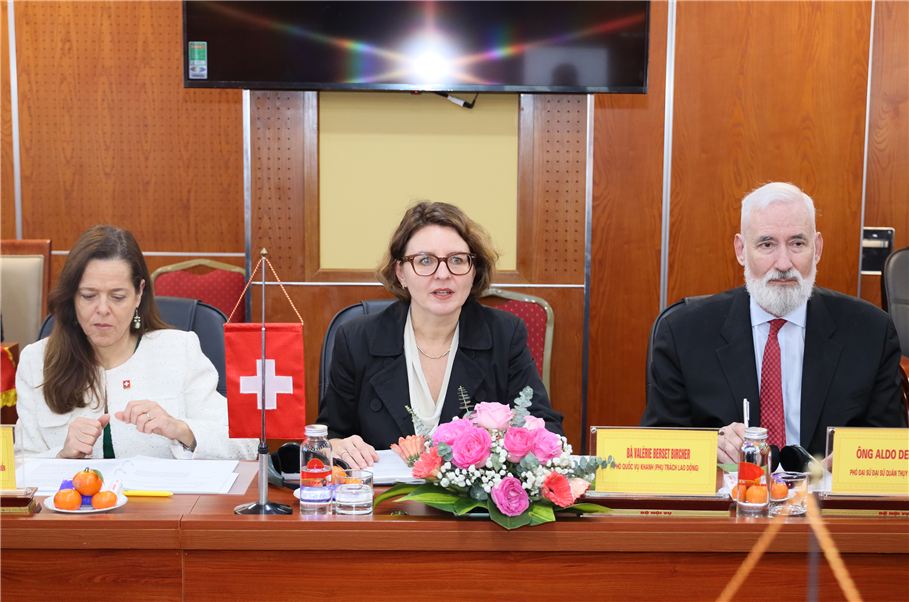 Thứ trưởng trao đổi: Trong những năm gần đây, Việt Nam đã nỗ lực hoàn thiện hệ thống chính sách, pháp luật về lao động, việc làm và an sinh xã hội theo hướng tiệm cận các chuẩn mực quốc tế, đồng thời phù hợp với điều kiện thực tiễn và trình độ phát triển của đất nước. Quá trình này được thực hiện trên cơ sở đối thoại và tham vấn rộng rãi với các bên liên quan, trong đó có sự đồng hành và hỗ trợ quan trọng của các đối tác quốc tế, bao gồm Thụy Sĩ.
