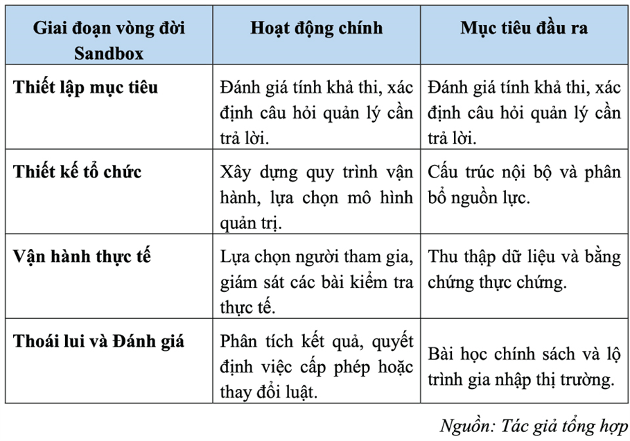 Các thành phần thiết kế và nguyên tắc vận hành: Một Sandbox hiệu quả không chỉ là việc miễn trừ quy định mà là một quá trình thu thập bằng chứng thực chứng để định hình khung pháp lý trong tương lai. Các yếu tố thiết kế cốt lõi bao gồm: