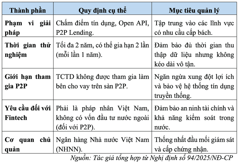 Sự ra đời của Nghị định số 94/2025/NĐ-CP ngày 29/4/2025 đánh dấu bước ngoặt quan trọng khi thiết lập khung pháp lý đầu tiên cho Sandbox trong lĩnh vực ngân hàng tại Việt Nam. Nghị định này cho phép thử nghiệm ba nhóm giải pháp chính: chấm điểm tín dụng, API mở và cho vay ngang hàng (P2P Lending).