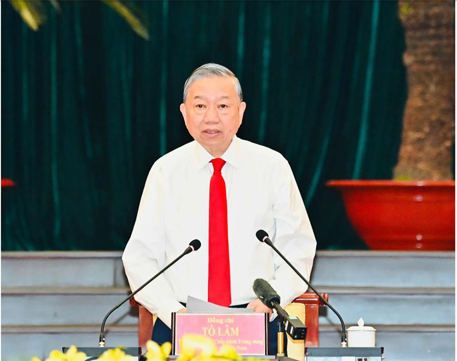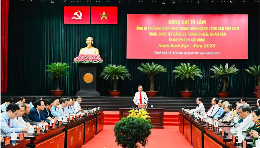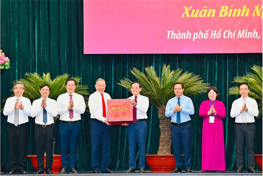 Thay mặt lãnh đạo Đảng, Nhà nước, Tổng Bí thư Tô Lâm thân ái gửi tới các đồng chí lãnh đạo, nguyên lãnh đạo Thành phố, các lão thành cách mạng, Mẹ Việt Nam Anh hùng, Anh hùng Lực lượng vũ trang, Anh hùng Lao động, các gia đình chính sách và toàn thể đồng bào, đồng chí TP. Hồ Chí Minh lời thăm hỏi ân cần, lời chúc mừng năm mới tốt đẹp nhất. Tổng Bí thư ghi nhận, đánh giá cao những nỗ lực, cố gắng và kết quả quan trọng mà Đảng bộ, chính quyền và Nhân dân Thành phố đã đạt được trong thời gian qua.