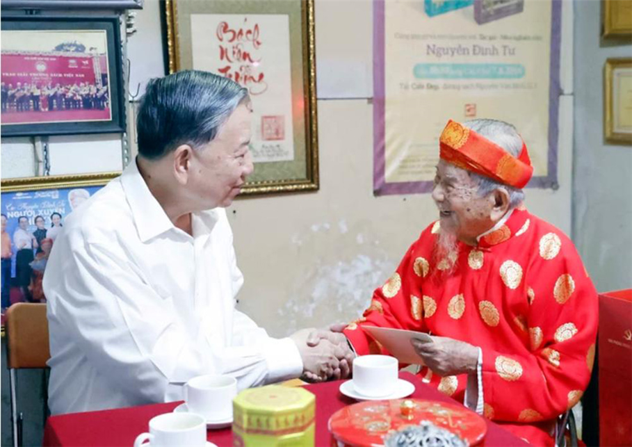 Tổng Bí thư Tô Lâm đến thăm, chúc Tết nhà nghiên cứu Nguyễn Đình Tư, 106 tuổi, người có nhiều công trình nghiên cứu về sử học, văn hoá có giá trị - Ảnh: TTXVN