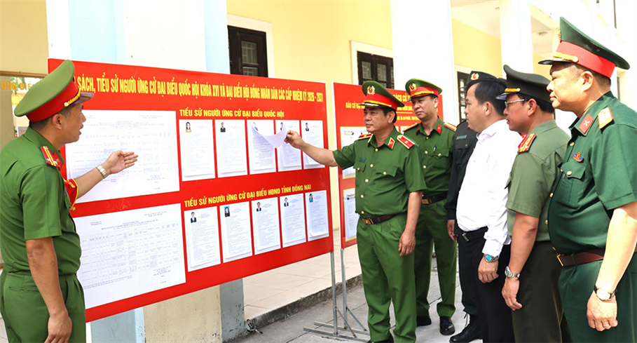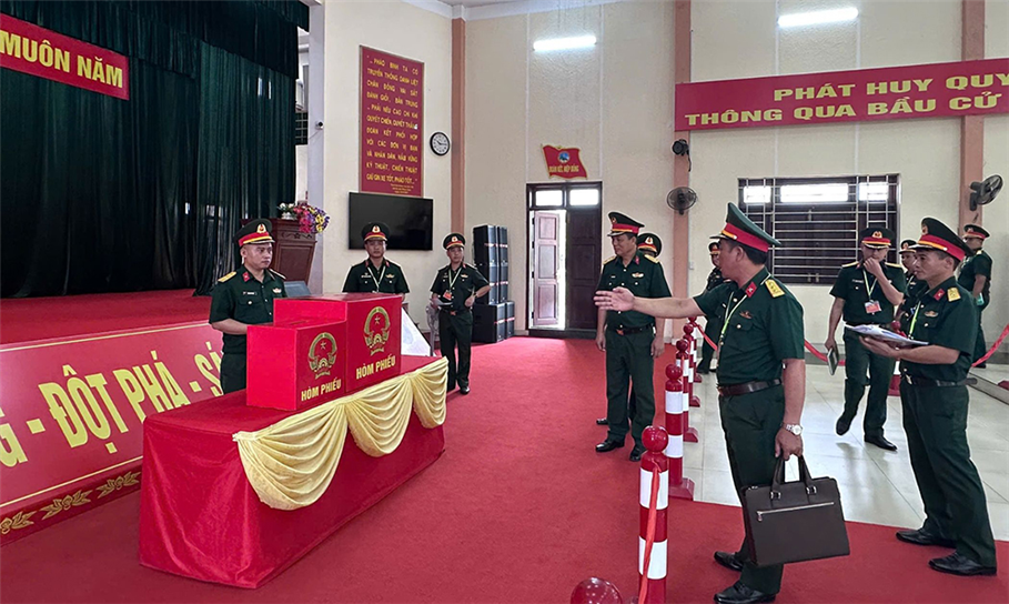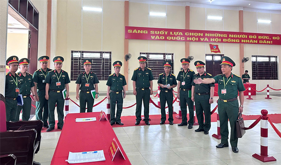 Thủ trưởng Bộ Tư lệnh Cảnh sát cơ động và các thành viên kiểm tra khu vực bỏ phiếu tại Trung tâm Huấn luyện bồi dưỡng nghiệp vụ và giáo dục nghề nghiệp số 2