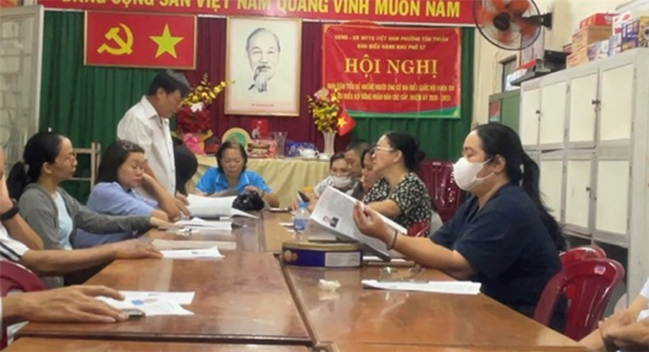 Các cử tri tại KP 57 (đơn vị bầu cử số 9), phườn Tân Thuận, TP.HCM tìm hiểu thông tin các ứng cử đại biểu Quốc hội và HĐND các cấp Thành phố